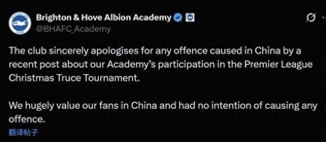 声明称,布莱顿俱乐部就近期一则对于青训学院投入英超圣诞休战四肢的帖子在中国形成的任何冒犯致以赤诚的歉意。